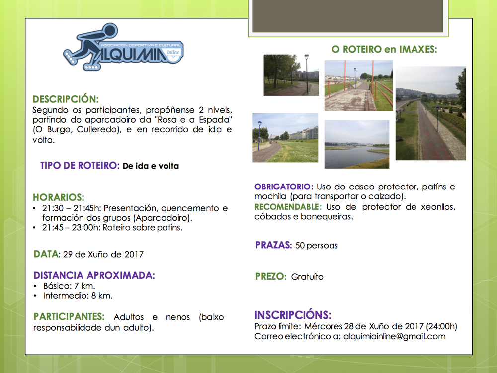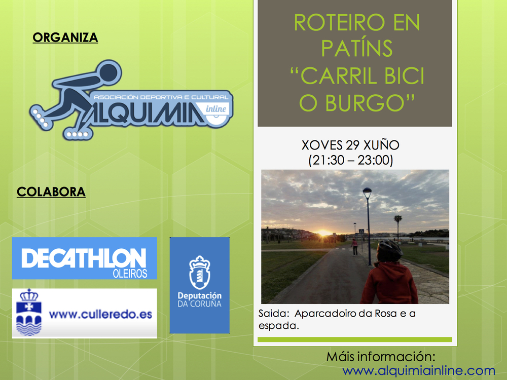 Como ven sendo habitual nos últimos seis anos, ADC Alquimia Inline, organiza un roteiro pola ría do Burgo o Xoves 29 a partires das 21:30.