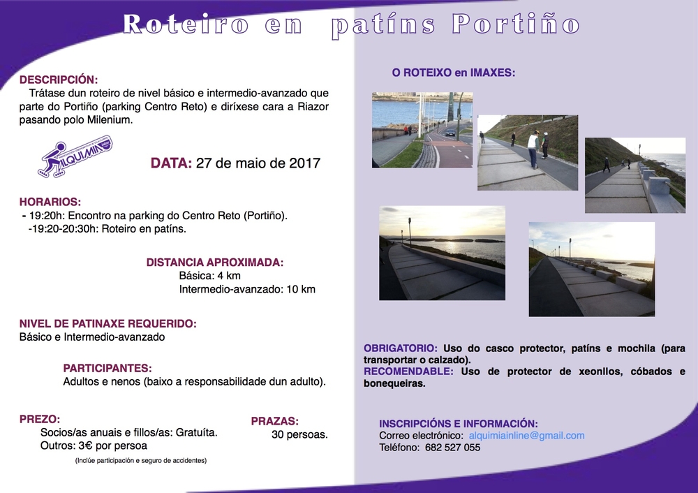 El sábado 27 de Mayo a las 19:30, saldremos del centro Reto de O Portiño. Esperamos que el buen tiempo nos acompañe para podrer disfrutar de las estupendas vistas que ofrece el paseo de este lado de A Coruña.
